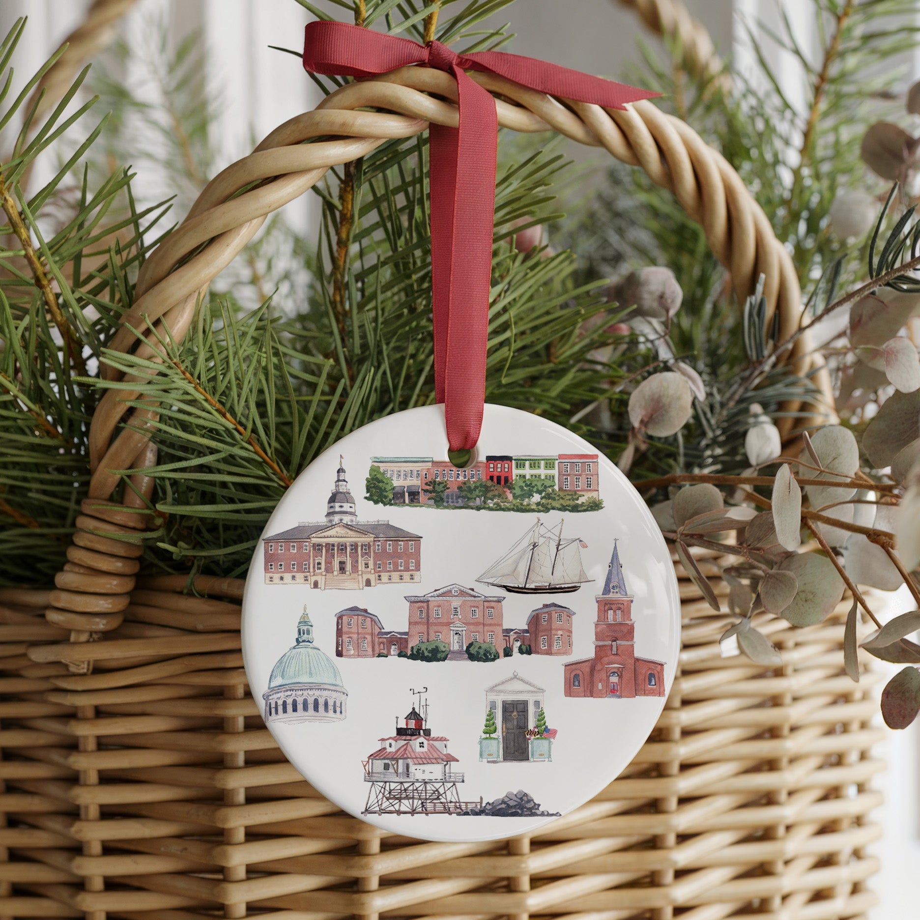 Celebrate Maryland’s capital in festive style with our Annapolis ornament, a hand-illustrated tribute to the city’s most beloved landmarks. From the State House dome and colonial architecture to sailboats and lighthouses on one side and the Annapolis sign on the other this design captures the perfect blend of history and coastal charm.