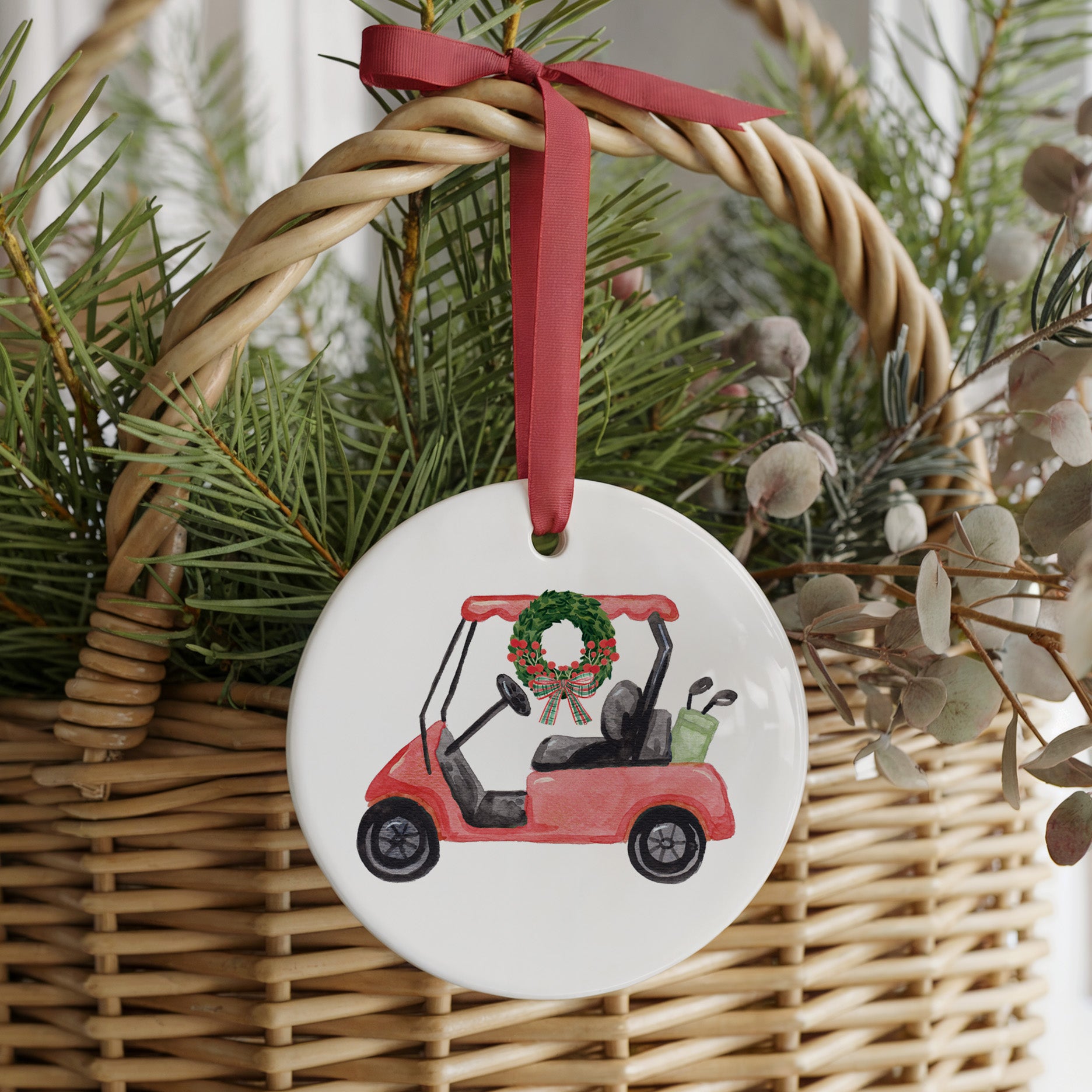 Tee up some holiday cheer with our Festivitiees Christmas Golf ornament — a festive favorite for golf lovers! One side features a bright red golf cart decked with a holiday wreath, while the other showcases a tartan-bowed wreath wrapped around crossed clubs — the perfect pairing of preppy and playful.