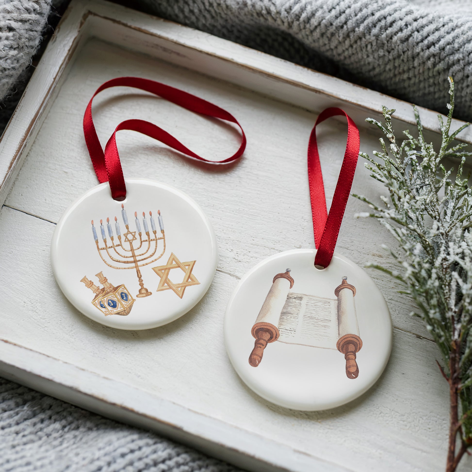 This 3" round ceramic ornament comes with a festive ribbon and makes a meaningful and artful addition to any Hanukkah décor. Perfect for gift givers who appreciate classic design with heartfelt warmth.