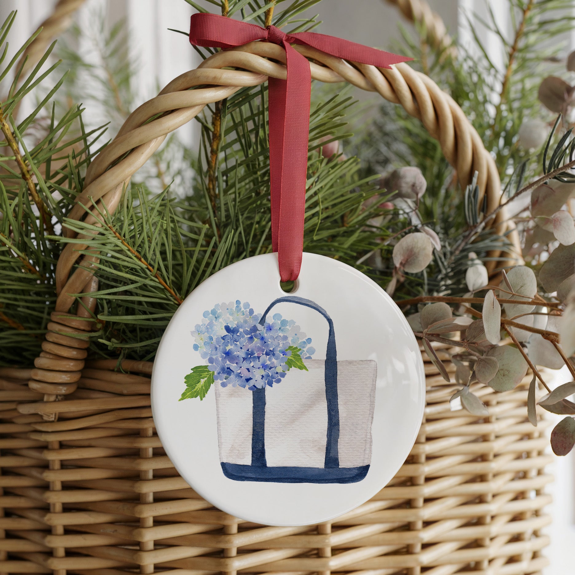 Bring coastal charm and preppy elegance to the holidays with our Islesboro Tote ornament. One side features a classic navy-and-cream canvas tote overflowing with blue hydrangeas, while the other highlights a single hydrangea bloom in soft watercolor detail — a timeless nod to seaside summers and island style.