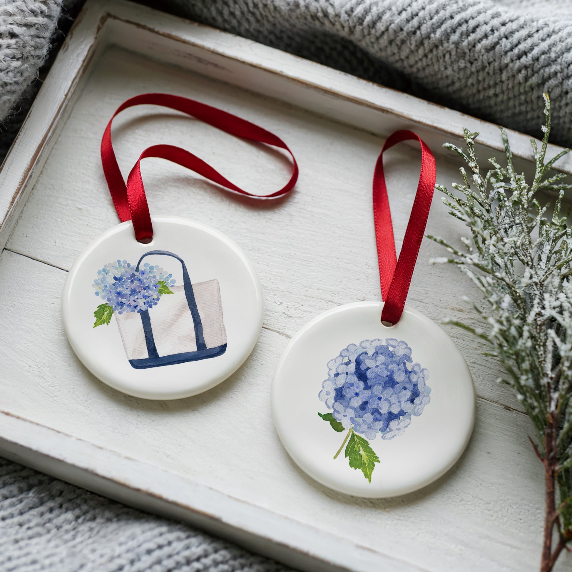 Featuring original artwork with watercolor detail on glossy ceramic and finished with a festive red ribbon, this 3" ornament adds effortless New England grace to any holiday tree. Perfect for anyone who loves the polished preppy look of hydrangeas and harbor life.