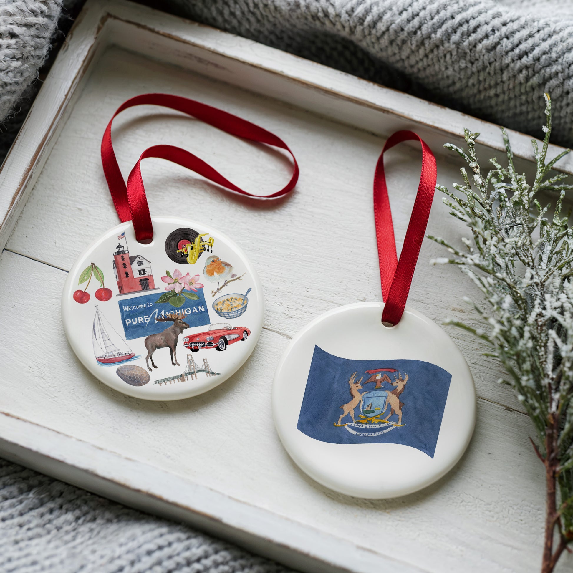 Celebrate the Great Lakes State in style with our Michigan Forever! ornament, a lovely tribute to everything that makes Michigan unforgettable. One side features watercolor icons of Michigan life while the other proudly displays the state flag in classic detail.