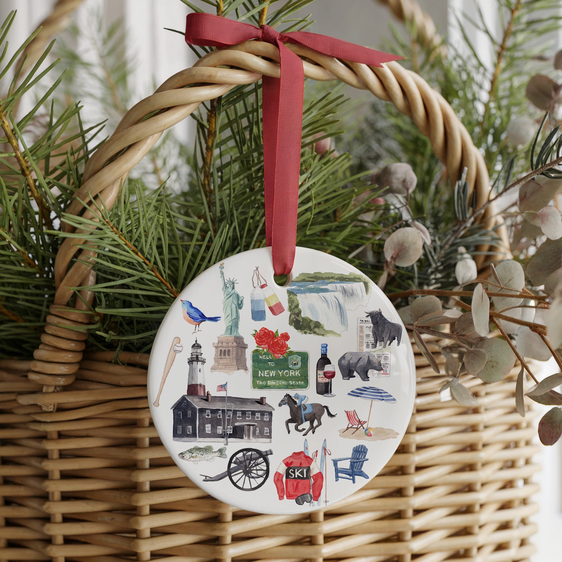 Featuring original artwork with watercolor detail on glossy ceramic and finished with a festive red ribbon, this 3" ornament is a perfect way to celebrate all things New York.
