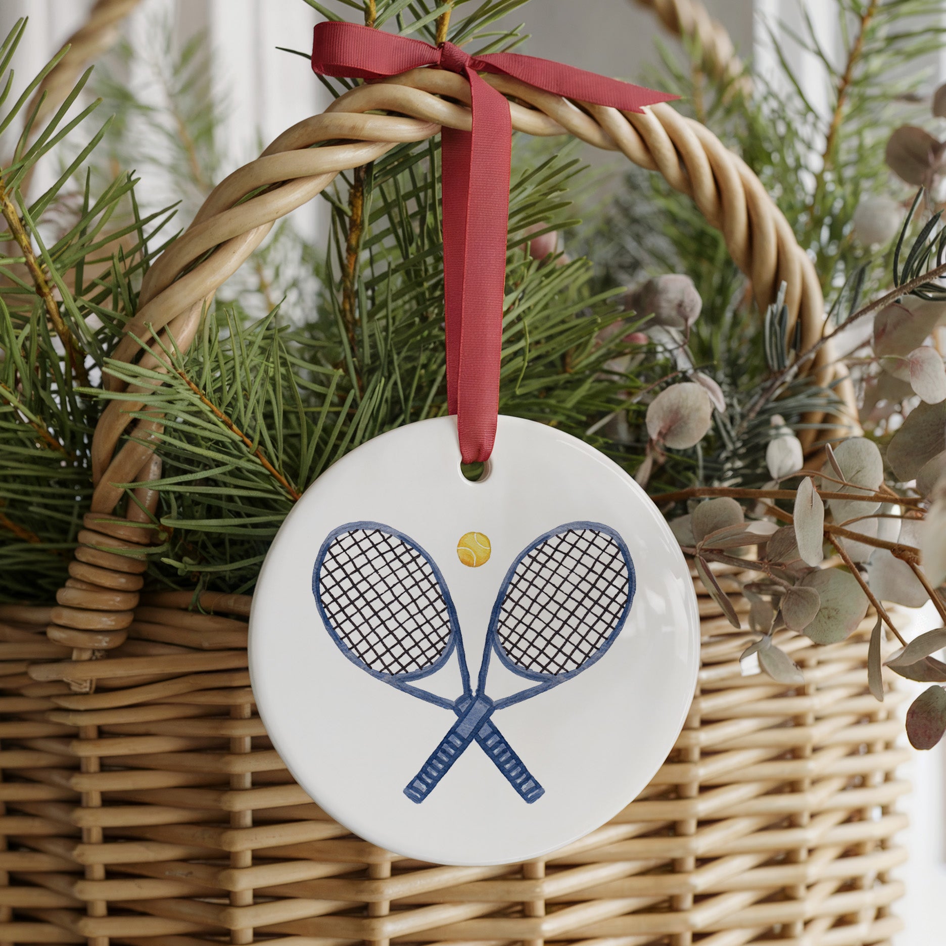 Featuring original artwork with watercolor detail on glossy ceramic and finished with a festive red ribbon, this 3" ornament brings sporty sophistication to any holiday tree. Perfect for tennis lovers who live for match points and martinis after.