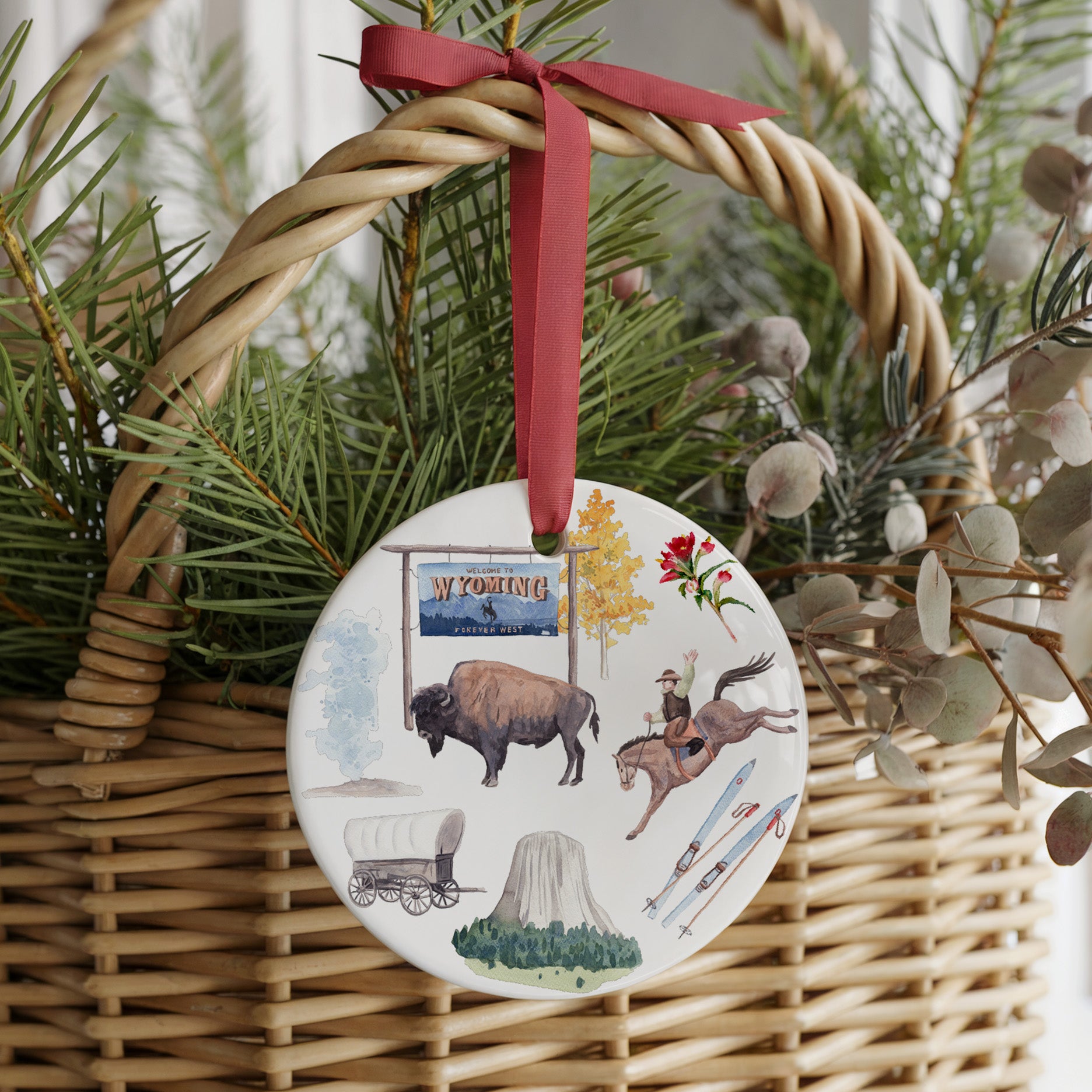 Celebrate the spirit of the Wild West with our Wyoming Forever! ornament, a hand-illustrated design that captures the rugged beauty of the state. The mighty bison, cowboy and iconic landmarks like the Devil’s Tower and “Welcome to Wyoming” sign grace one side, the Wyoming flag on the other. This ornament brings frontier charm to holiday décor.